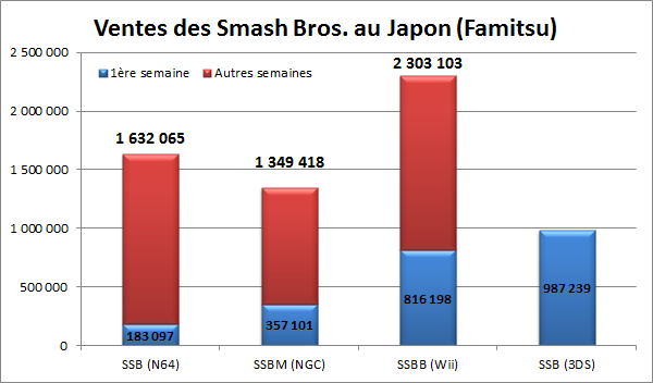 Oscar Lemaire affiche un graphique sur Twitter pour montrer la meilleure vente de la série Smash Bros dont les chiffres sont sorti par Famitsu. On peut constater sur le graphique, pendant la première semaine de lancement, Super Smash Bros sur Nintendo 3DS se vent le plus en comparaison de même franchise. Sans aucun doute, la version Nintendo 3DS va garder la place de meilleure vente jusque'à ce qu'il aura un nouveau titre au futur.